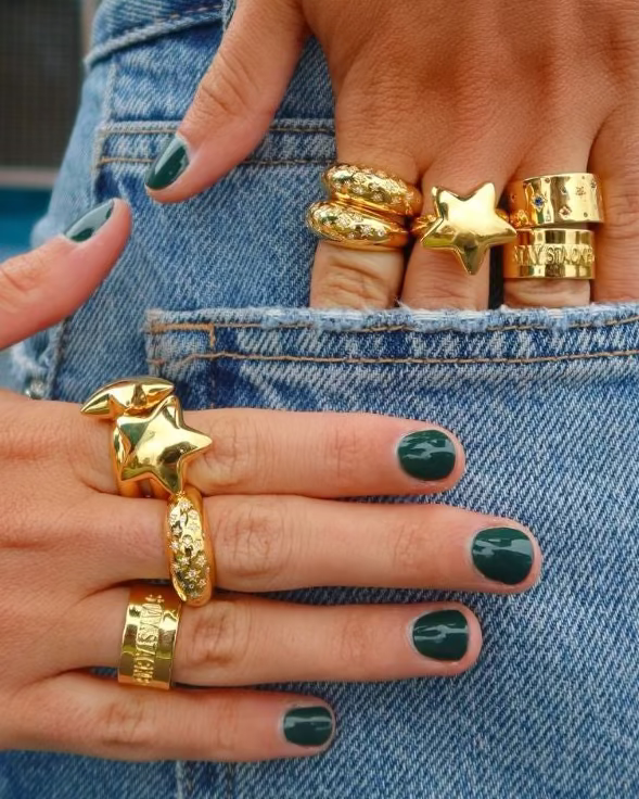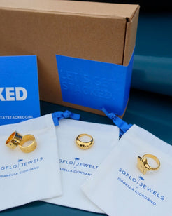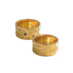 A bold take on the classic cigar band — this two-sided ring features CZ rainbow star stones that shimmer from one side, and “STAY STACKED” engraved on the other as a reminder to keep shining in your own way.